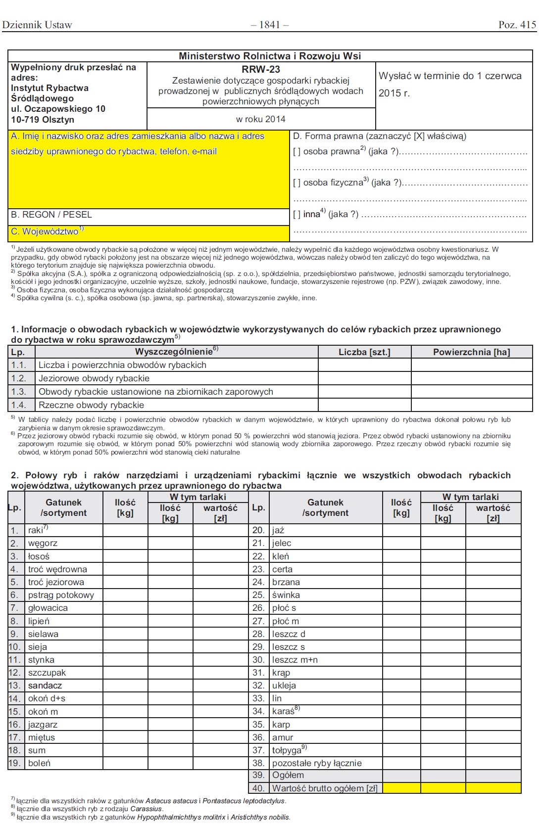 - RRW-23a Zestawienie dotyczące gospodarki rybackiej prowadzonej w publicznych śródlądowych wodach powierzchniowych płynących Typ: jpg Rozmiar: 577.8 Kb Dodano: 22 lipca 2015r. Pobrany: 889 raz(y)